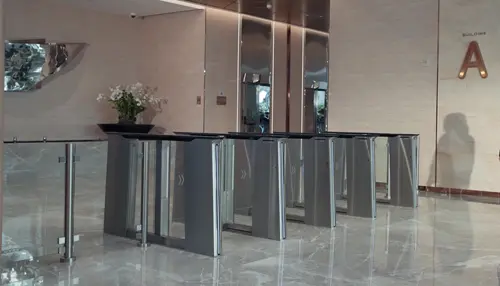 At the main entrances of both towers, ten Ultra Smart Swing Barriers (DS-K3B961TX) are paired with Pro Face Access Terminals (DS-K1T673DWX), supporting both facial recognition and QR code access.