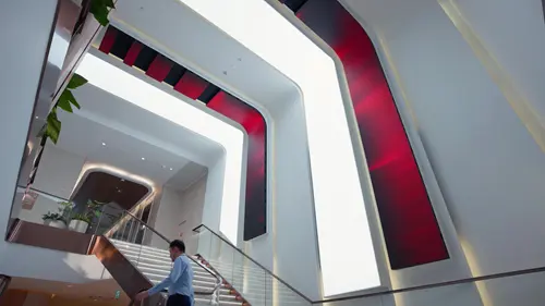 The new smart building solutions also includes digital displays which have both functional and aesthetic roles. In the lobby, 12.9 m² of curved LED walls (DS-D4518FI-CBF) create an inviting atmosphere which showcases seasonal content. Digital signage (DS-D6055UN-B, DS-D6086UN) screens are used to deliver announcements, directions, and promotional material. Tenants can also rent display time for branding, opening a new revenue channel.