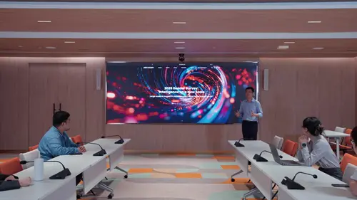 In the conference room, high-resolution visuals for presentations are made possible with a 7.09 m² screen (DS-D4215CI-ZWDH(B)) which features COB LED flip-chip technology to maximize brightness and image clarity. Outside the building, meanwhile, a 2 m² outdoor LED screen (DS-D4239FO-GLFL) communicates events and public messages to passersby.